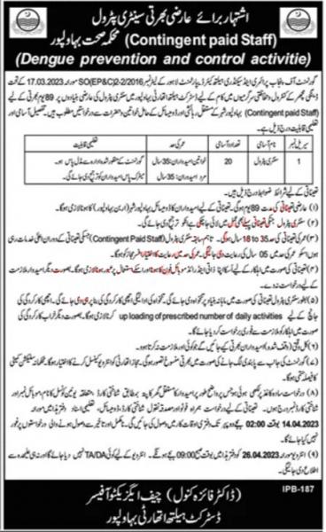 Applications are invited for the temporary recruitment of Sentry Patrol (Contingent Paid Staff) for 89 days to work in Dengue mosquito control and prevention activities, under the Government of Punjab Primary and Secondary Health Care Department Lahore's letter No. 2/2016-SO (EP&C2) dated 17.03.2023. The position is open for men and women who are permanent residents and domiciled in Bahawalpur city.
